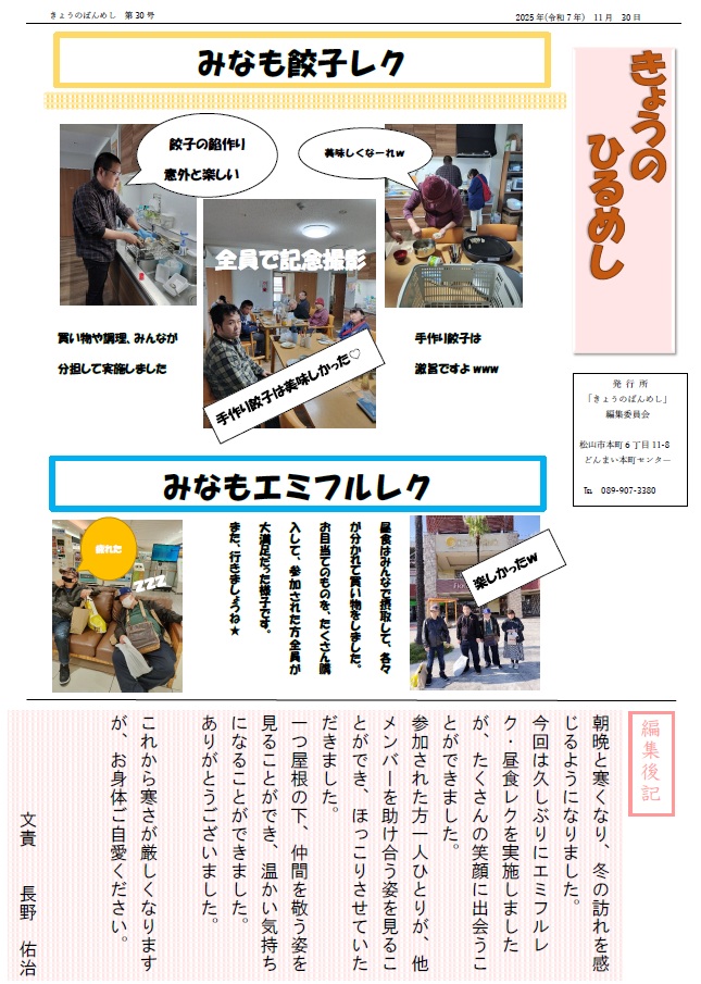 グループホームの「壁新聞」、「きょうのばんめし」11月号(第30号)をお届けします。