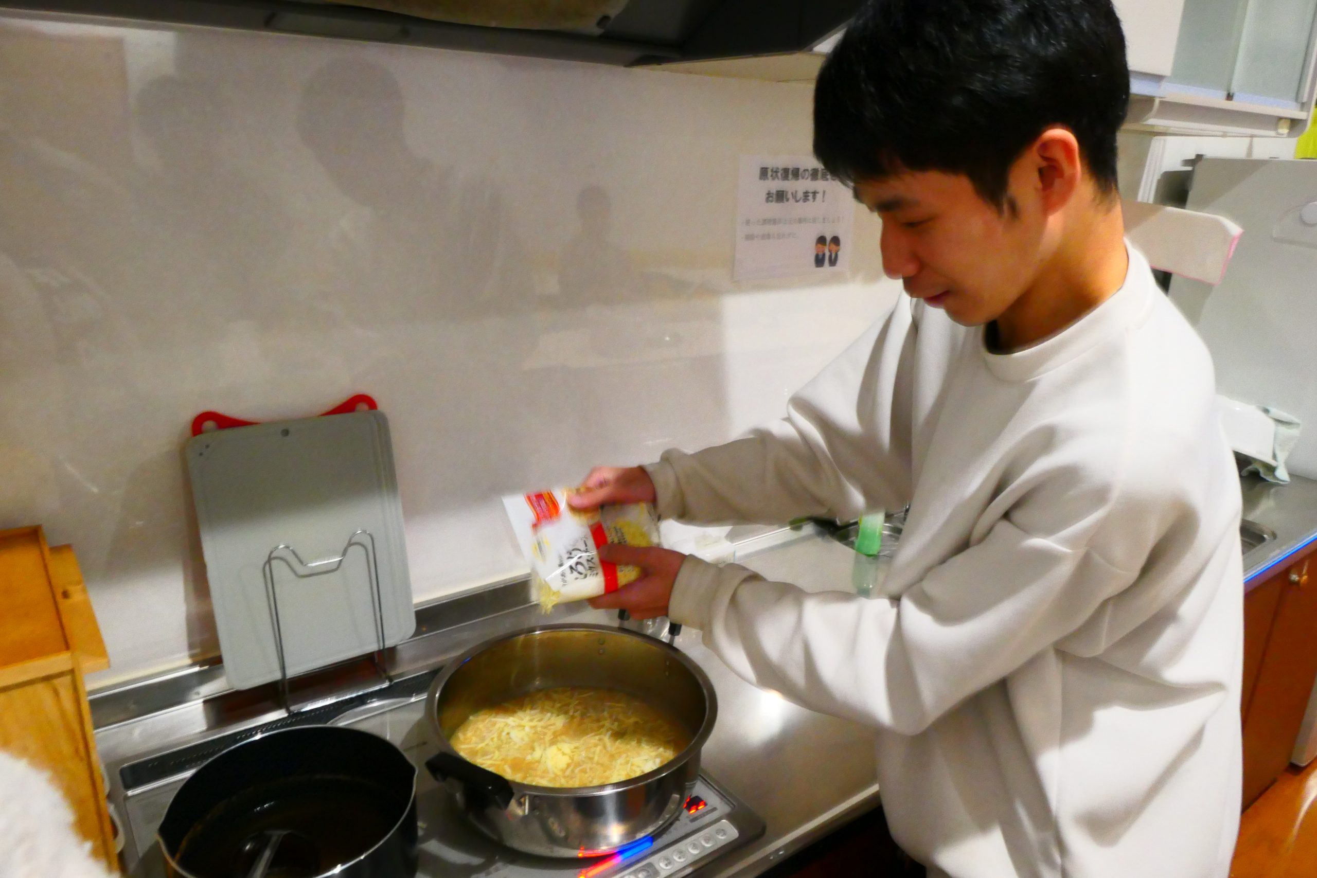 2袋入れようとしたチーズを見て「チーズ2袋は多いって」とアドバイスを受ける、チーズ好きの参加者(笑)