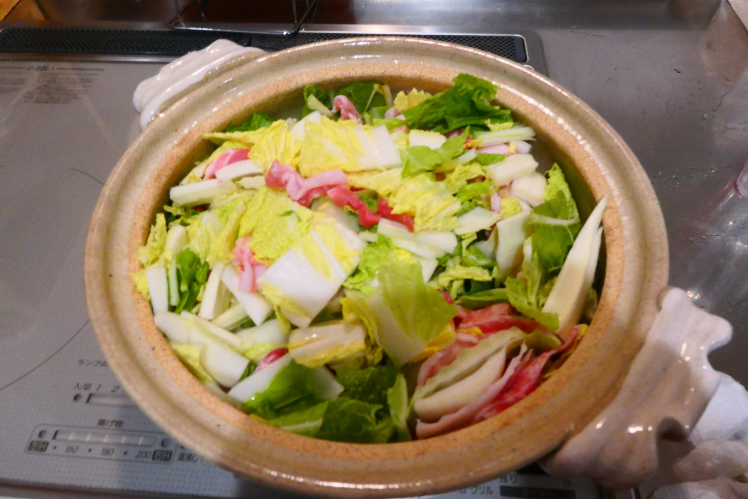 白菜を切り、豚肉を切り、重ねながら、鍋に詰めていきます。